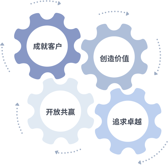 成就客户是一切决策的出发点,创造价值是衡量所有工作的标准,追求卓越是米兰milan中国-做事做人的态度,开放共赢是米兰milan中国-的格局也是最终的结果。价值观的齿轮环环相扣,推动着组织里的每个人不断向前。